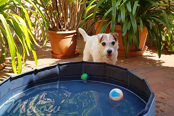 Mein Schnüffelteppich kam später zum Einsatz und ich suchte, bis kein Futter mehr unter den Fransen zu finden war. Nachdem wir uns alle den Bauch vollgeschlagen hatten, wurde der Pool abgedeckt und Spielzeug flog hinein. Zoe und ich holten es abwechselnd heraus.